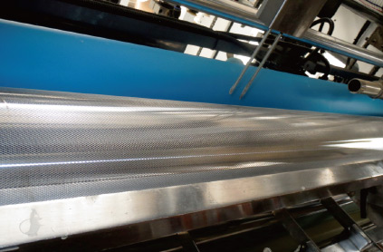 該涂膠部分,采用工藝的網(wǎng)紋輥,使整機(jī)涂膠均勻,并且與傳統(tǒng)工藝的網(wǎng)紋輥相比較,每平米涂膠量可降低約5克。